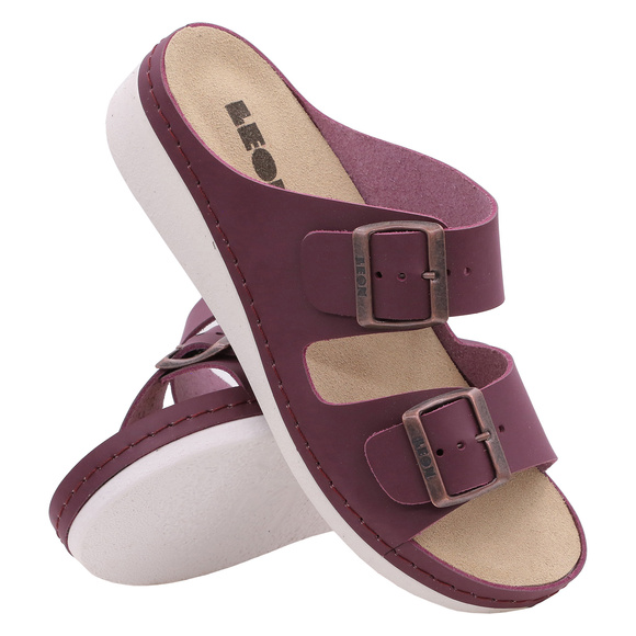 - LEON - klapki damskie casual, profilaktyczne, sanitarne o charakterze rekreacyjnym, produkcji włoskiej. Wierzch: tworzywo skóropodobne. Podszewka: naturalna bawełna. Wkładka wewnętrzna: naturalna skóra. Spód: lekkie tworzywo PU.