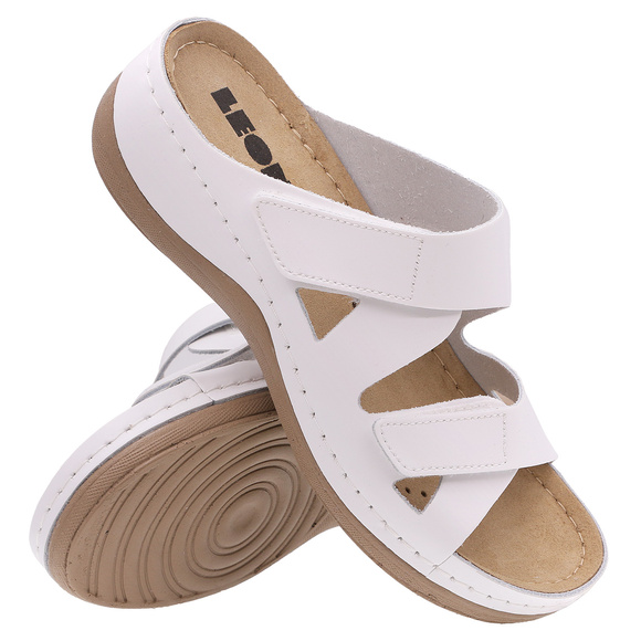 • LEON - klapki damskie casual, profilaktyczne, o charakterze rekreacyjnym. Wierzch: skóra naturalna. Wkładka wewnętrzna: naturalna skóra. Spód: lekkie tworzywo PU.