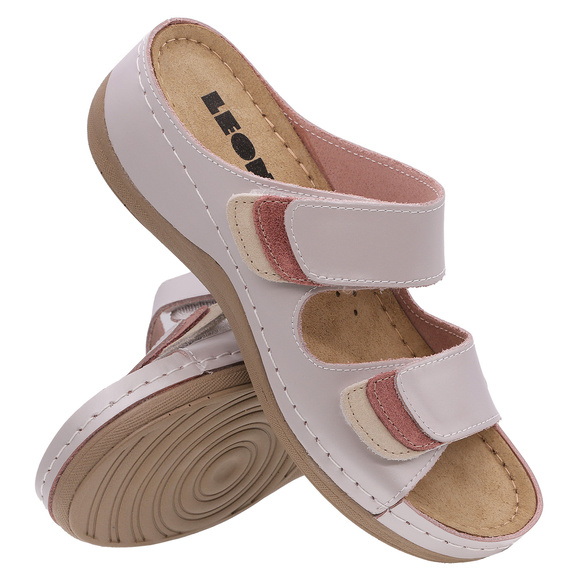 • LEON - klapki damskie casual, profilaktyczne, o charakterze rekreacyjnym. Wierzch: skóra naturalna. Wkładka wewnętrzna: naturalna skóra. Spód: lekkie tworzywo PU.